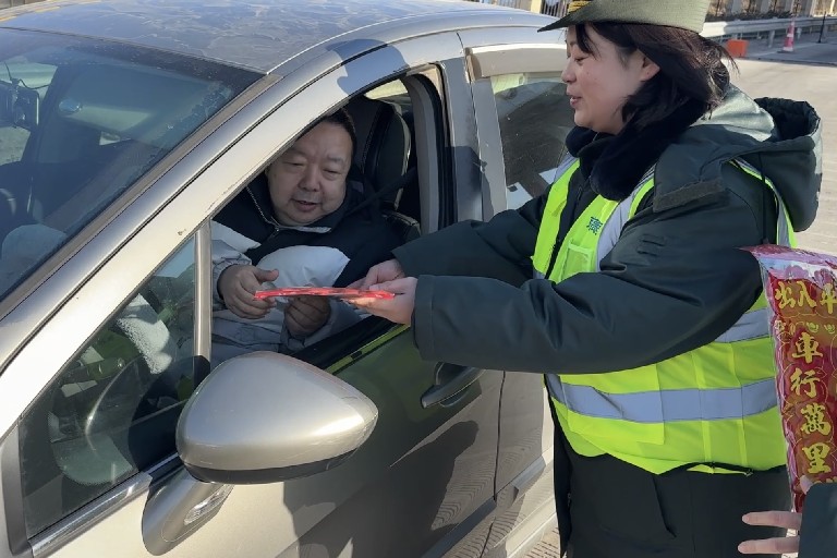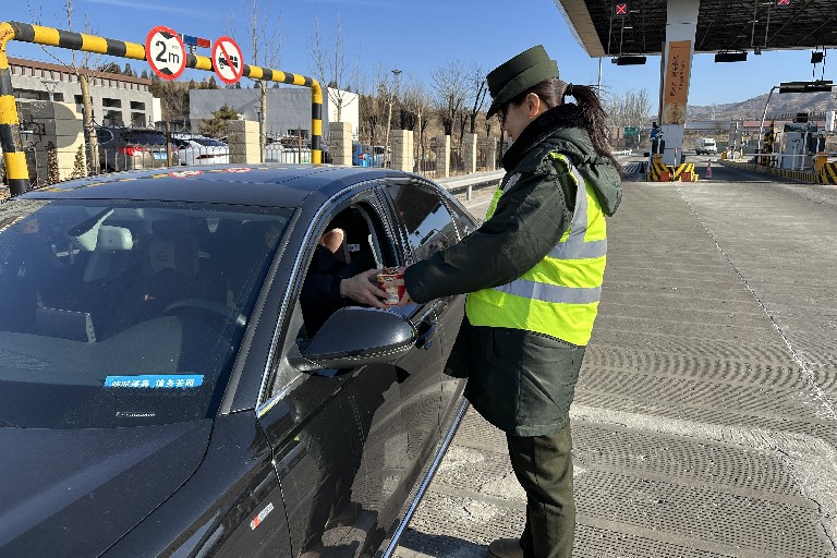 “师傅,送您一副车贴对联,祝您一路平安!”“师傅,吃碗热乎面暖和暖和吧!”服务过程中,工作人员热情地为过往司乘送上精心准备的对联、“福”字、挂饰等春节礼品,并为旅途劳顿的司机王先生递上热气腾腾的泡面。一句句真诚的问候、一次次贴心的帮助,让广大司乘在寒冬腊月感受到收费站暖心的服务和浓浓的温情。