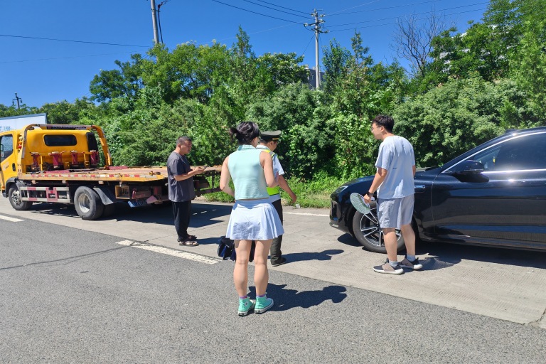 大约15分钟后,拖车准时到达,在驿站工作人员的协助下顺利将故障车拖走前往修理厂。临行前,司机多次向工作人员道谢:“谢谢,太感谢了,这么热的天你们不仅帮我们联系拖车,还一直陪着我们,十分感谢。”