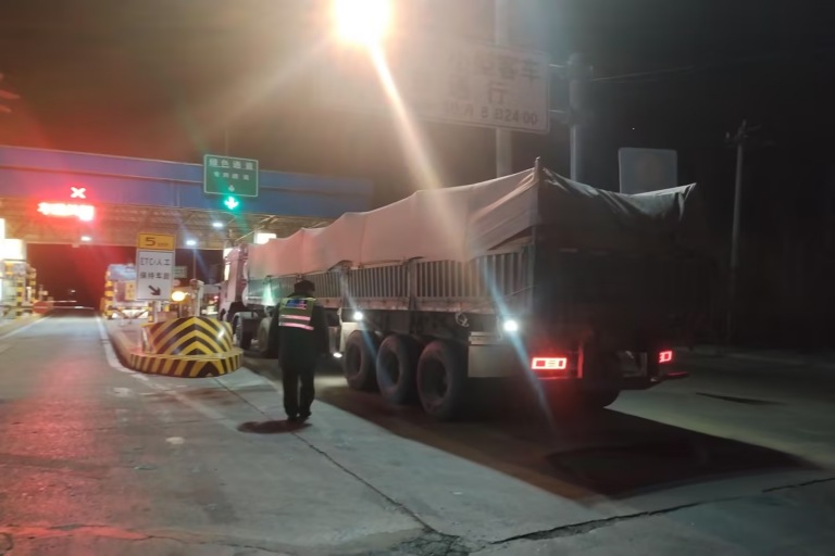 21:30,鸡鸣驿站入口广场驶入一队重载半挂车辆,收费人员通过观察发现其行驶状态和声音异常,判断车辆吨位较大。当班班长迅速带领疏导人员前往称台处监督其称重过程,在头车驶入称重车道过程中,果然发现车辆后三轴在通过称台时有明显起伏变化,挂车车身也随着车轴上下呈现出异常起伏。收费人员迅速关闭交易天线,防止其刷开etc设备上道,同时报告值班站长。值班站长立即与高速路政怀来大大值班人员联系,前往车道对车辆进行控制查扣,后方同行车队见状,纷纷掉头驶离。